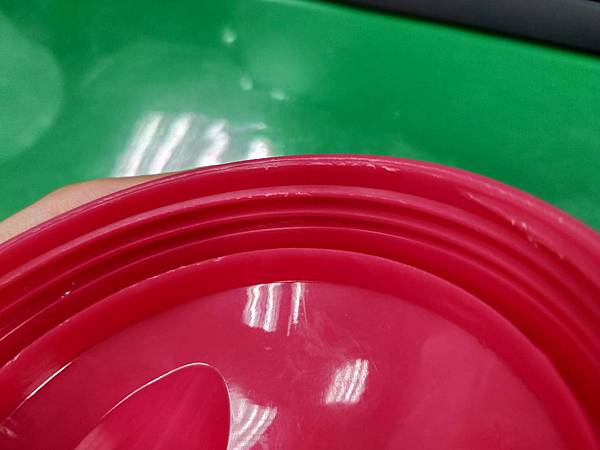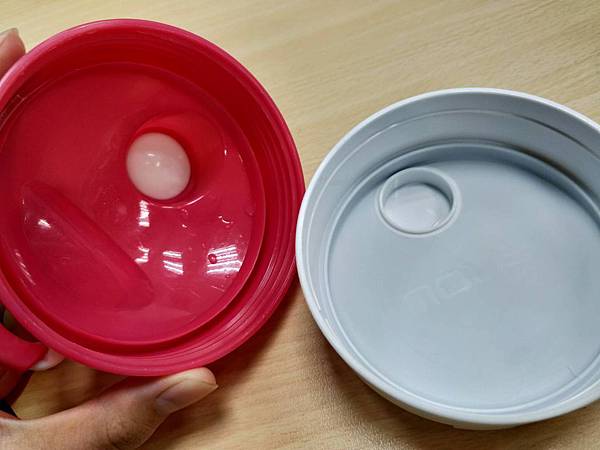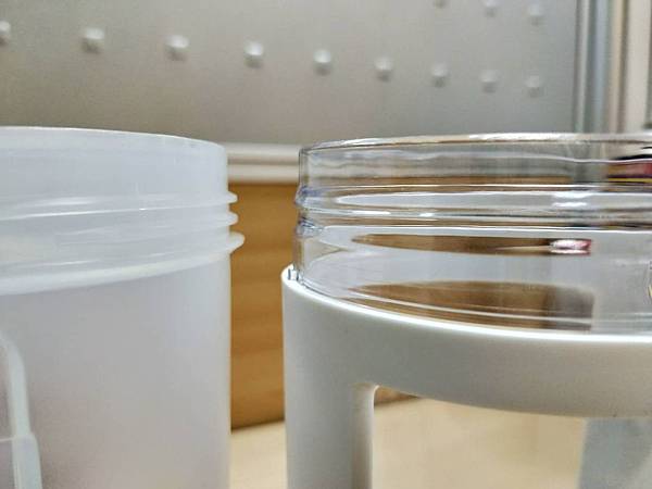 小紅的杯蓋可以看得出來有很多被鐵球刮傷的傷痕,尖角螺紋是垂直的,會比較不好清洗,相對容易藏汙納垢、滋生細菌,還有一些塑膠毛邊,不知道是怎麼回事。🐝 🐝 🐝